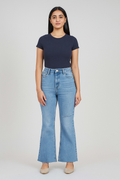 ultra high-rise fit and a flared silhouette that widens significantly from the knee down