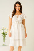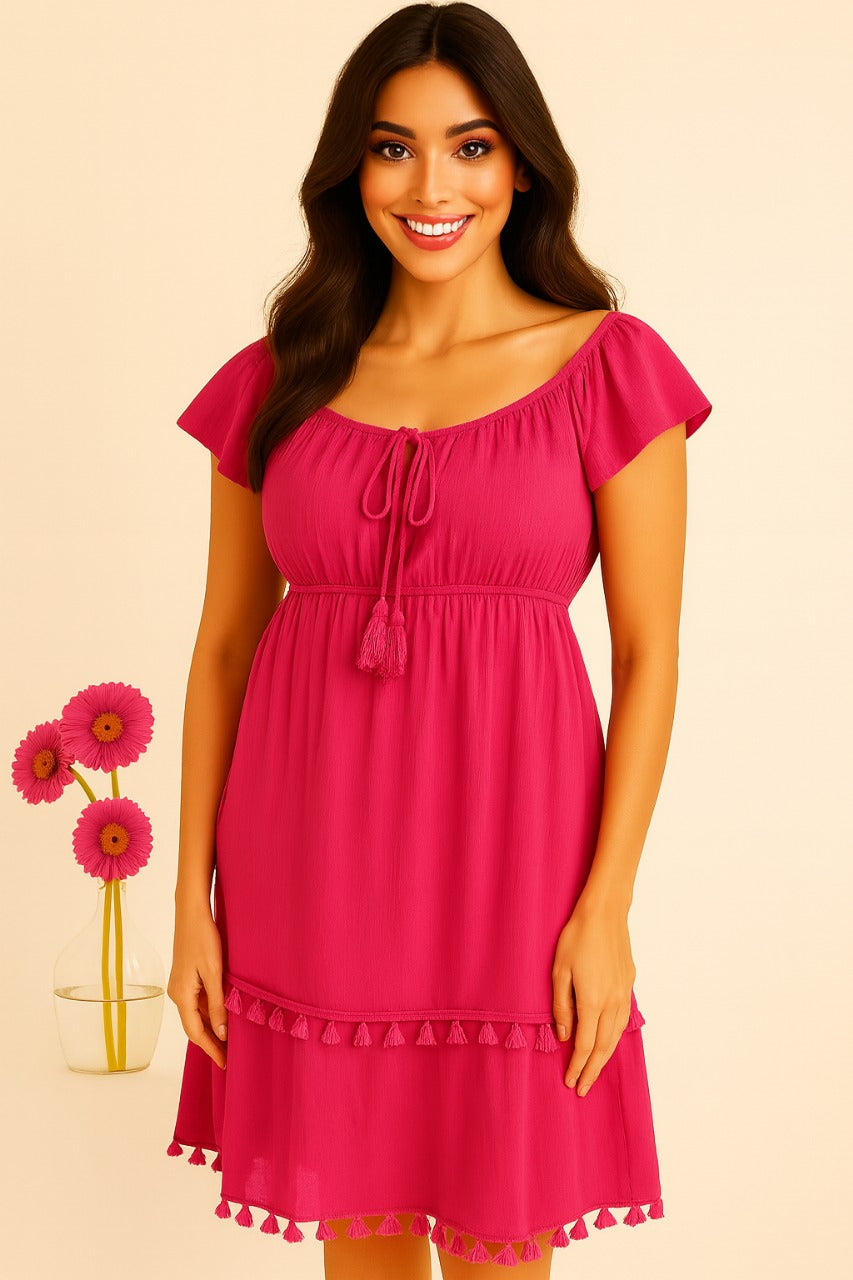 This dress features a square neckline, short puff sleeves, and a tiered skirt with pom-pom trim. It has a relaxed fit and is made from a lightweight material, making it comfortable for warm weather. The dress has a gathered bodice with a drawstring tie.